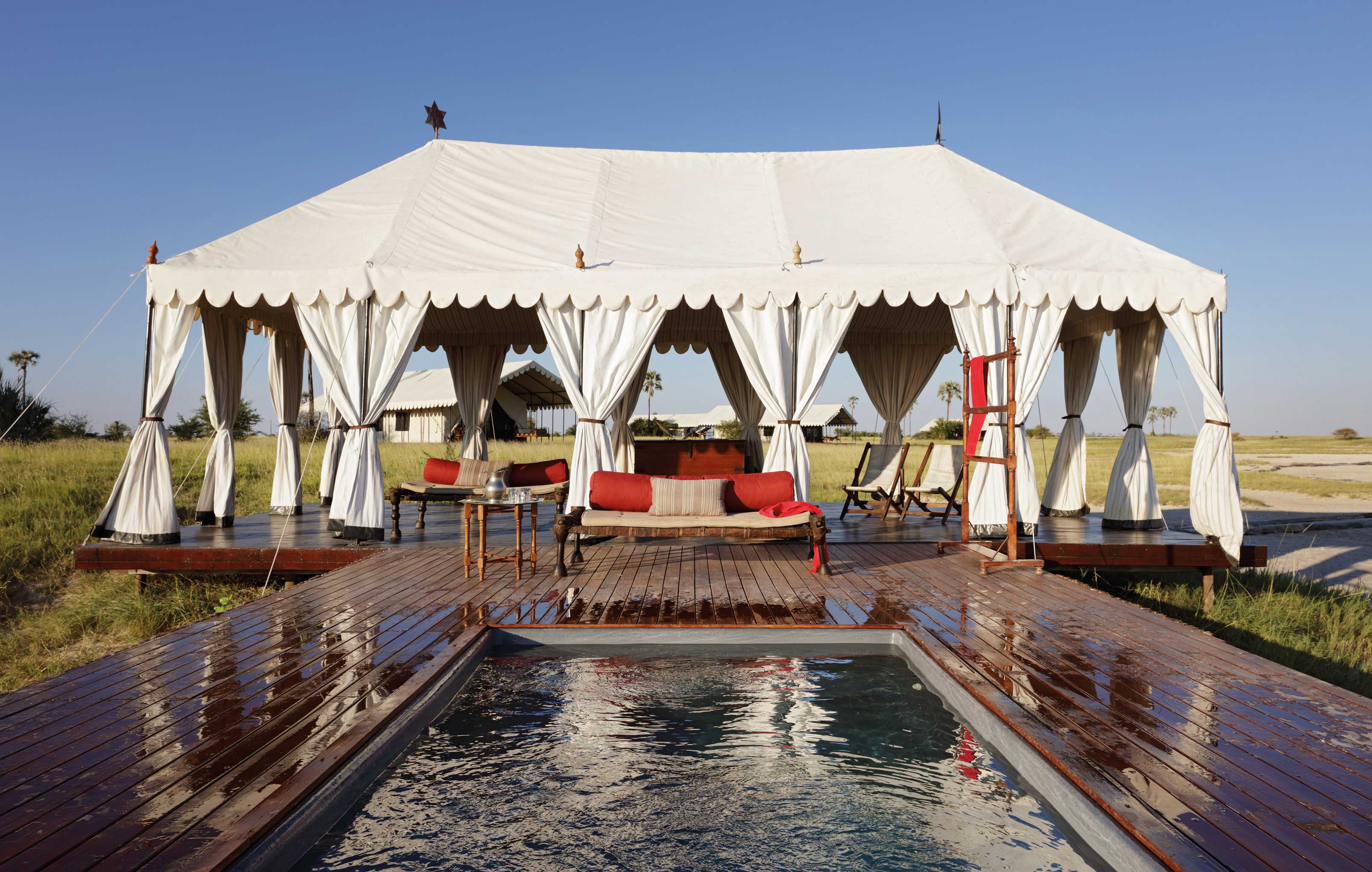 Imagine a smattering of billowing white tents, shaded by desert palms and surrounded by a thousand acres of shimmering, sparkling nothingness. You’ve just dreamt up San Camp, our impossibly romantic, seven-bedroom camp on the edge of the Ntwetwe Pan in Botswana’s Makgadikgadi. San isn’t a place for frills and fluffiness. The magic is in the minimalism, both at the camp and in the mysterious desert landscape. You can forget the tourist crowds and over-stuffed 4x4s too; it’s just you, the wildlife, and a handful of local San Bushmen, waiting to share their secrets with you.